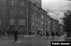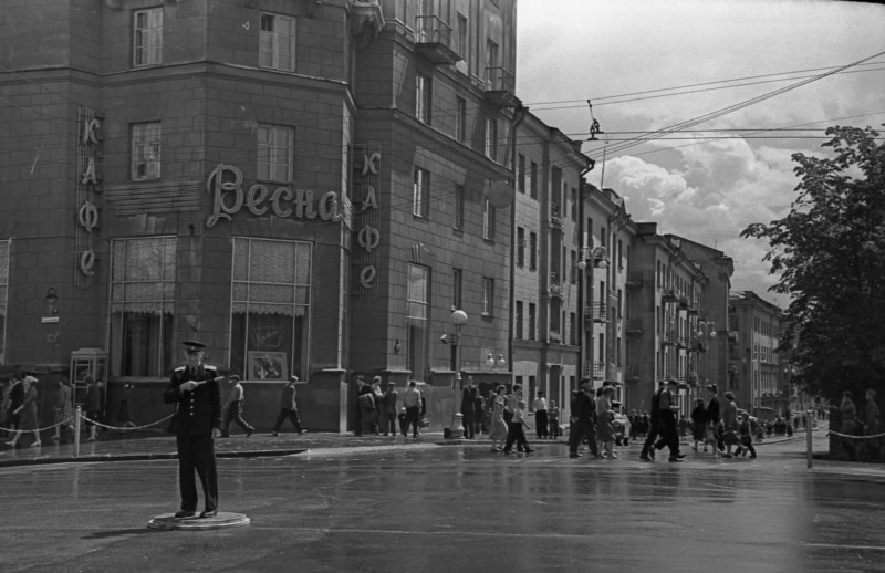 Праз дарогу заўсёды шматлюдная кніжная крама на праспэкце, а насупраць яшчэ больш шматлюдны рэстаран, адзін зь пяці ў горадзе, дзе за два рублі наведнік можа набыць смажаны язык ці курыцу з бульбай і тушанай капустай, а ня проста “катлеты” (хлеб і мясны фарш) ці шніцэль (дзе крыху болей мяса і менш хлеба) і біфштэкс (адна перамолатая ялавічына), якія падаюцца з бульбай, капустай і часам з макаронамі. Іх заўсёды падаюць у рабочых сталоўках і стаячых кафэ, адкрытых уначы. Часам можна купіць салодкія булачкі, каву, восеньскую садавіну, таксама можна ўзяць салаты і памідоры. Побач з кафэ, якое называецца “Вясна” – булачная. Тут за 13 капеек можна купіць белы батон (без упакоўкі), за 7 капеек – розную салодкую выпечку і за 20 капеек бохан чорнага хлеба. (Бохан чорнага ўдвая большы за белы і такім чынам больш танны ў пераліку за кіляграм і карыстаецца большым попытам. І яшчэ, чорны хлеб з-за цьвёрдай скарынкі выключна доўга застаецца сьвежым.)