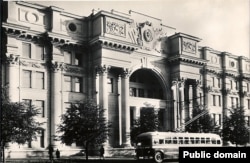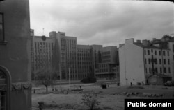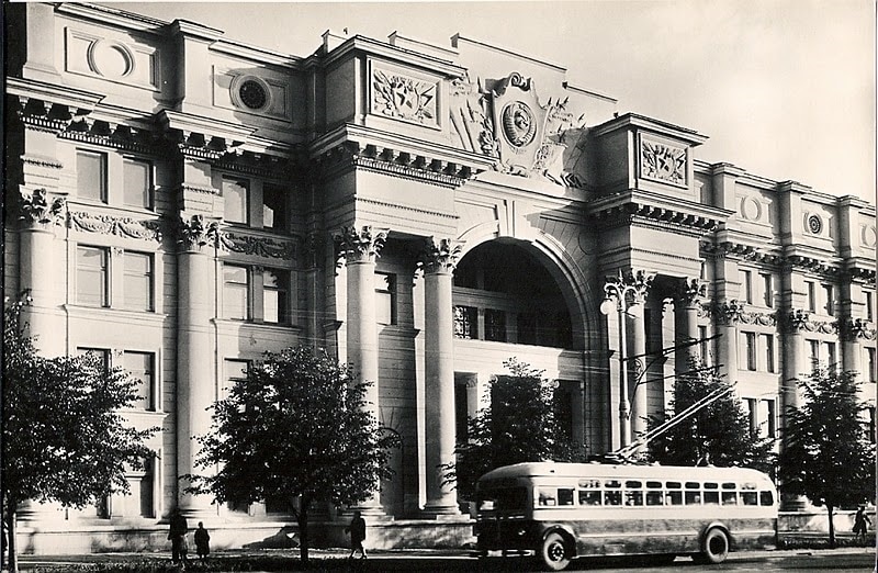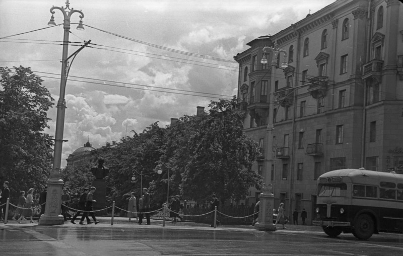 А самы, бадай, прыгожы будынак на праспэкце пасьпелі завяршыць да хрушчоўскай пастановы – ён знаходзіўся насупраць гатэлю: