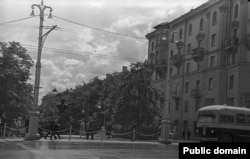 За аэрапортам, які служыць усходняй мяжой, перад намі вялікая раскінутая гарадзкая забудова, якая толькі выглядае як горад. На даляглядзе заводзкія карпусы і коміны сьведчаць пра яго індустрыяльны характар; я кажу “выглядае”, бо самы высокі будынак – дзевяціпавярховы Дом ураду на адным канцы галоўнай вуліцы, праспэкту Сталіна, які даўжэйшы за дзьве мілі, адзіны такі бульвар у рэспубліцы. Усе астатнія вуліцы – вузкія брукаванкі, якія ўюцца праз горад як каменныя рэчкі ад галоўнай вуліцы, і выходзяць на абшырныя паркі.