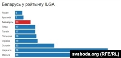 Апошні рэйтынг ад Міжнароднай асацыяцыі лесьбіянак, геяў, трансгэндэраў і інтэрсэксуалаў (ILGA) сьведчыць, што сытуацыя з правамі ЛГБТ мала зьмянілася і ў 2017 годзе. Паводле асноўных крытэраў — адпаведнасьці заканадаўчай базы і адносінаў грамадзтва да ЛГБТ-супольнасьці — Беларусь атрымала 13 балаў з магчымых 100, што сьведчыць пра высокую ступень дыскрымінацыі і няроўнасьці. Гэта, аднак, характэрна і для астатніх краінаў рэгіёну.