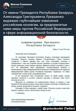 Зранку 11 чэрвеня ў акаўнце Максіма Рыжанкова, закінутым з восені 2016 году, зьявіліся выбачэньні «расейскім калегам за прынятыя меры супраць Расейскай Фэдэрацыі ў сфэры інфармацыйнай бясьпекі» з далучаным фота ліста, падпісанага нібыта кіраўніком адміністрацыі прэзыдэнта. За што менавіта «прасілі прабачэньня», зь ліста не зразумець.