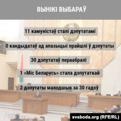 1 — столькі дзяўчат, якія маюць тытул «Міс Беларусь», сталі дэпутатамі Палаты прадстаўнікоў. Дэпутаткай, паводле ЦВК, абралі Марыю Васілевіч, якая часам суправаджае Аляксандра Лукашэнку ў рабочых паездках.